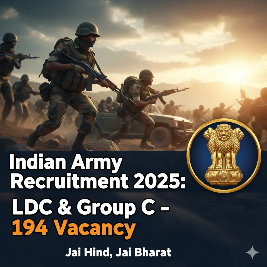 अगर आप Indian Army में नौकरी करने का सपना देखते हैं, तो ये मौका आपके लिए है। Indian Army Recruitment 2025 के तहत LDC समेत Group C के कुल 194 पदों के लिए भर्ती निकली है। इच्छुक उम्मीदवार 4 अक्टूबर 2025 से ऑनलाइन आवेदन कर सकते हैं। इस पोस्ट में हम आपको सारी जरूरी जानकारी आसान भाषा में बताएंगे ताकि आप आसानी से आवेदन कर सकें।