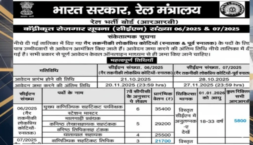 सरकारी नौकरी की तलाश में हैं? तो सुनिए, Railway Bharti 2025 Apply का सुनहरा अवसर आ गया है। Railway Recruitment Board (RRB) ने इस वर्ष ग्रेजुएट और 12वीं पास दोनों श्रेणियों के लिए भर्ती की घोषणा कर दी है। ग्रेजुएट लेवल के लिए कुल 5,810 पद घोषित किए गए हैं। साथ ही, 12वीं पास श्रेणी (अंडर-ग्रेजुएट) के लिए लगभग 3,050 पद उपलब्ध हैं — मिलकर कुल लगभग 8,860 वैकेंसी।